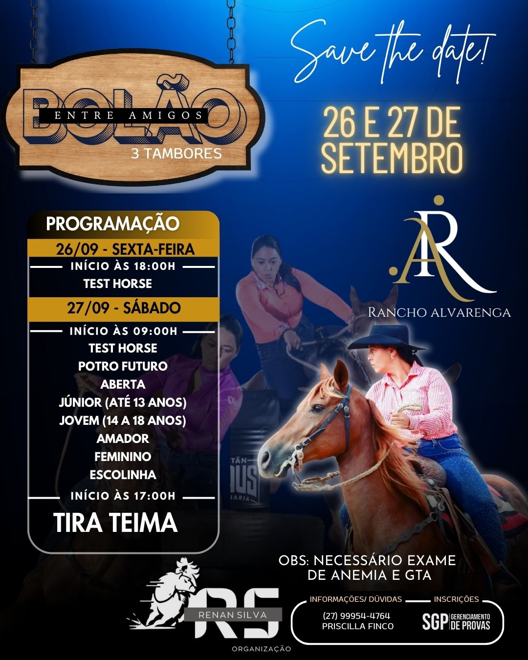 Bolão Entre Amigos RANCHO ALVARENGA 2025 - 26 a 27 de Setembro de 2025 - Rancho Alvarenga - Linhares, ES • 249 inscrições no evento • 72 animais no evento • 69 competidores no evento • Premiação distribuída: R$ 19.412,00