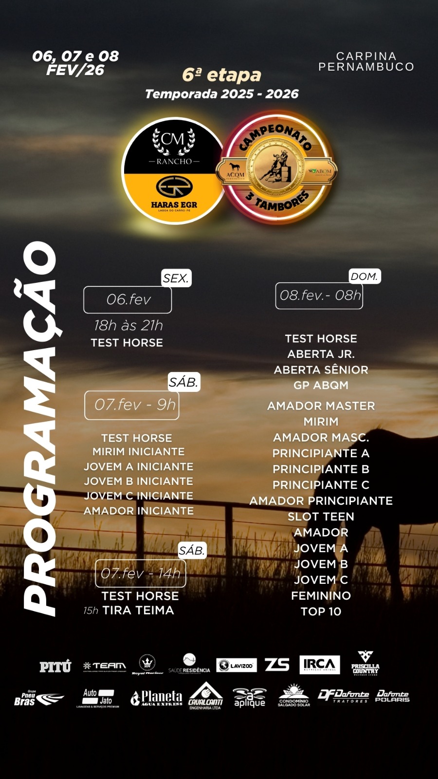 6ª Etapa Campeonato PE 2025/2026 - 06 a 08 de Fevereiro de 2026 - Pq. de Exposições - Carpina, PE| Pos | Cavalo | Proprietário | Total R$ |