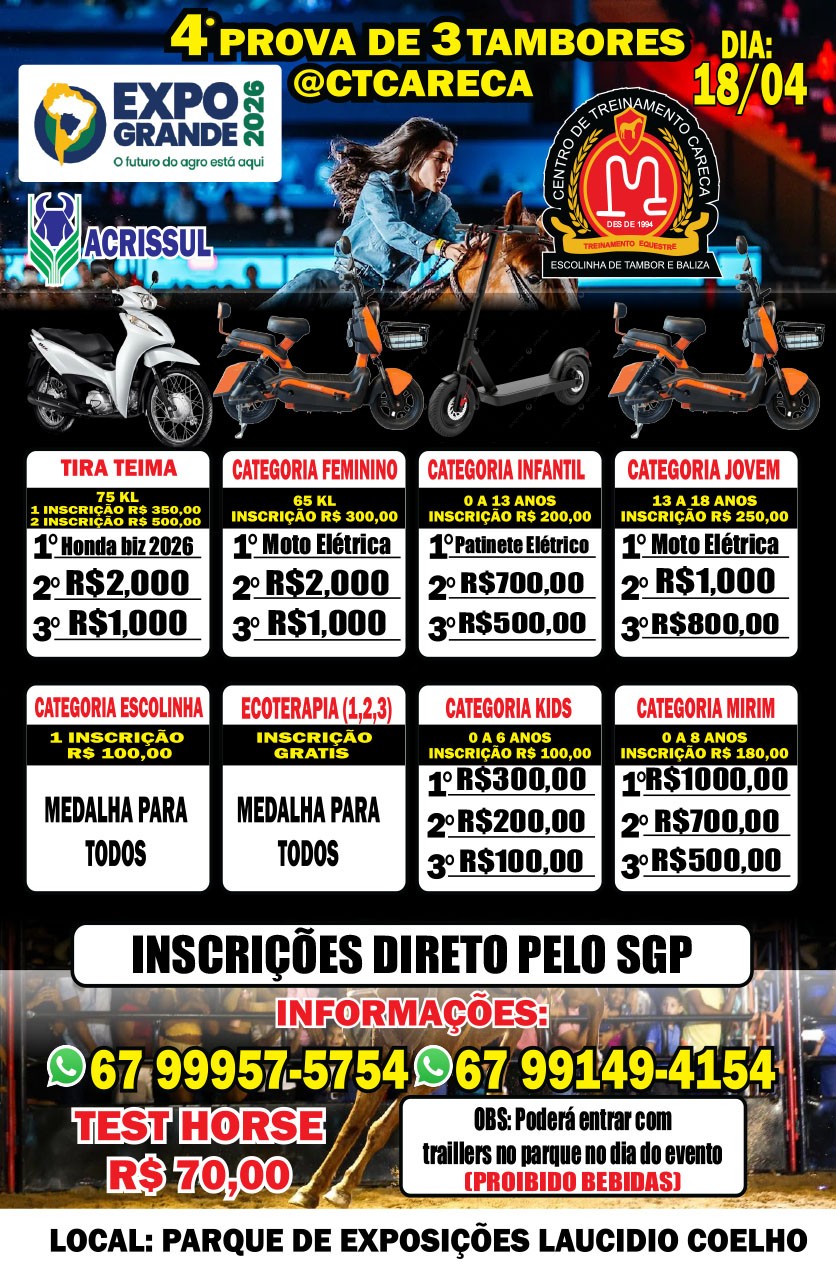 4ª Prova de 3 Tambores CT Careca - 18 de Abril de 2026 - Pq. de Exposições - Campo Grande, MS