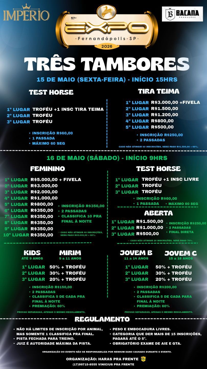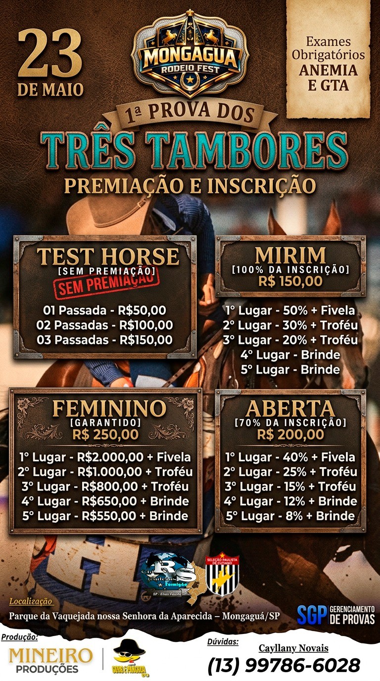 Prova Três Tambores Exponova 2026 - 30 de Abril a 02 de Maio de 2026 - Pq. de Exposições - Nova Xavantina, MT