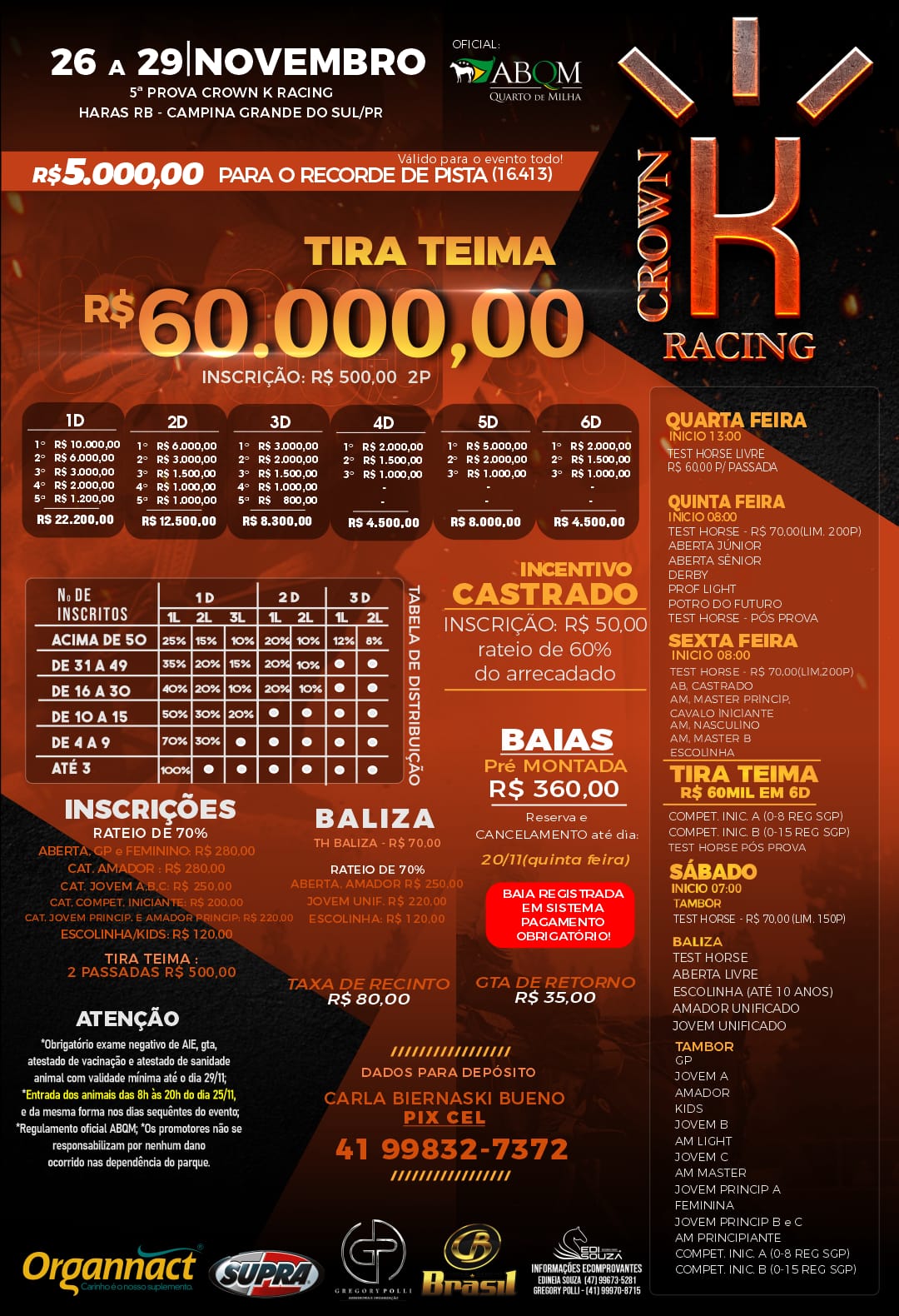 5° Prova Crown K Racing - 26 a 29 de Novembro de 2025 - Haras Rancho Brasil - Campina Grande do Sul, PR