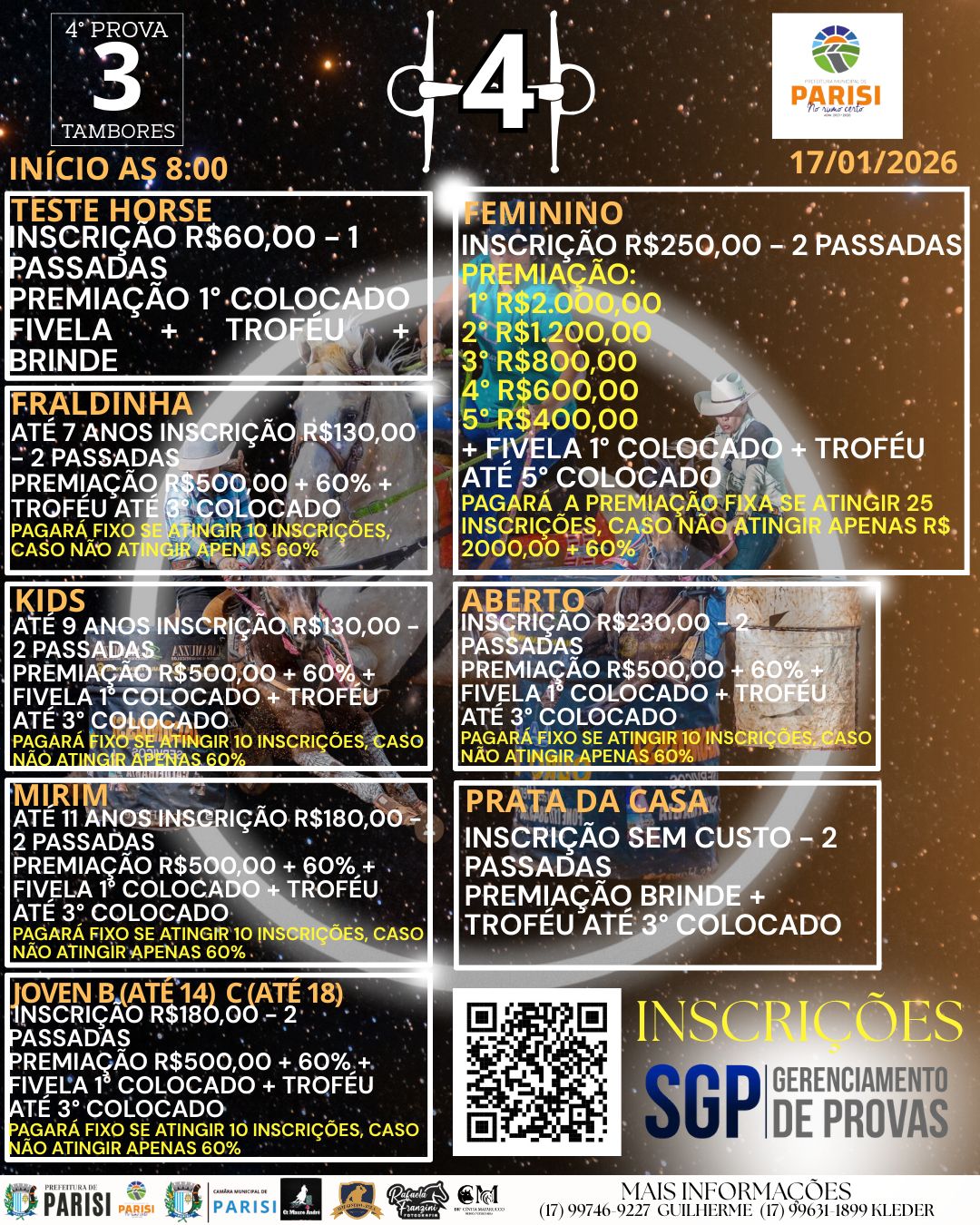 4ª Prova de 3 Tambores de Parisi - 17 de Janeiro de 2026 - Recinto de Festa - Parisi, SP