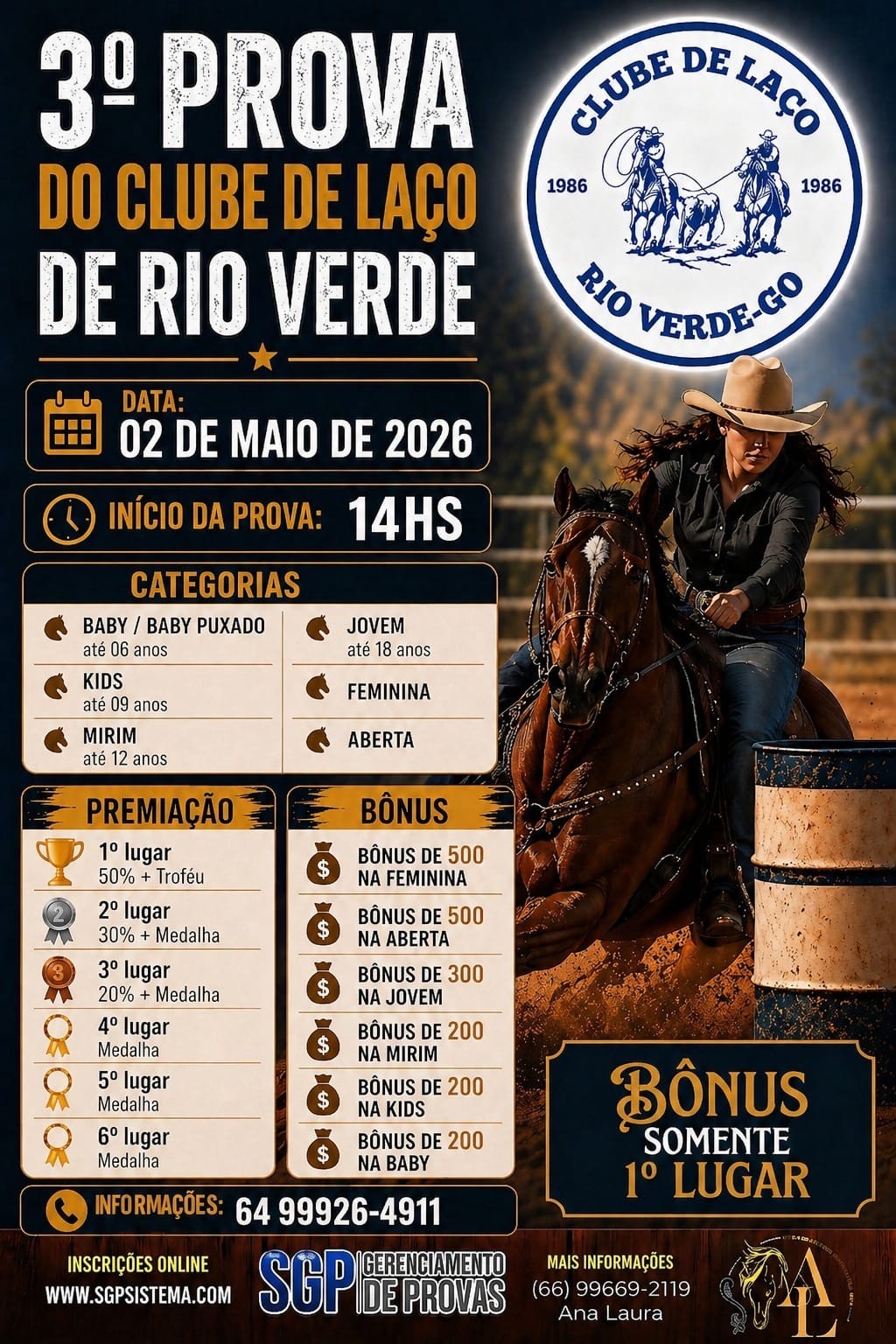 III Prova do Clube de Laço - 02 de Maio de 2026 - Clube do Laço - Rio Verde, GO| Pos | Cavalo | Proprietário | Total R$ |