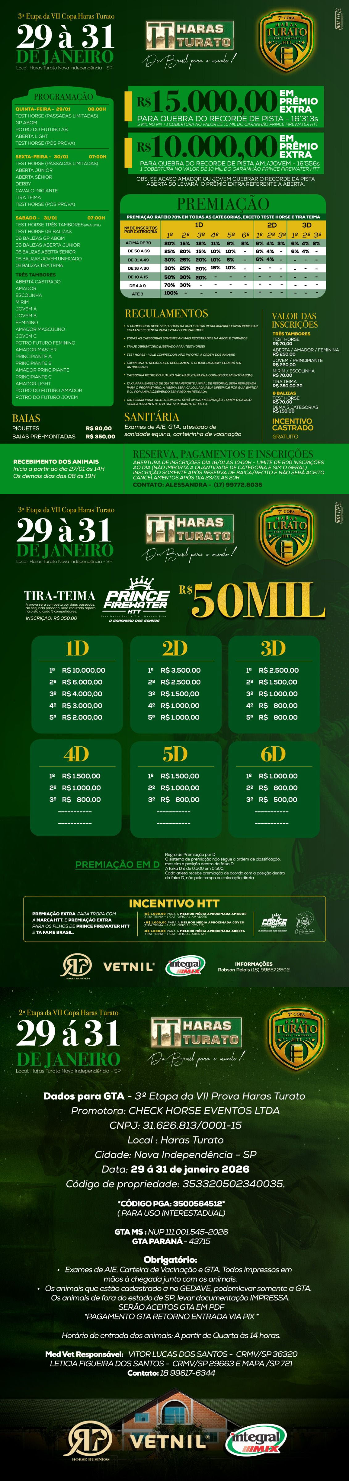 3ª Etapa da VII Copa Haras Turato - 29 a 31 de Janeiro de 2026 - Haras Turato - Nova Independência, SP • 1076 inscrições no evento • 348 animais no evento • 137 competidores no evento • Premiação distribuída: R$ 13.814,00