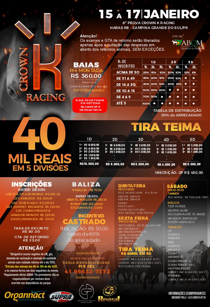 6° Prova Crown K Racing - 15 a 17 de Janeiro de 2026 - Haras Rancho Brasil - Campina Grande do Sul, PR